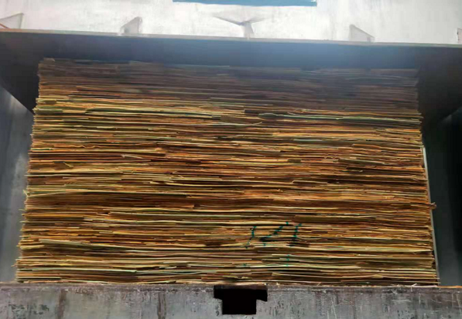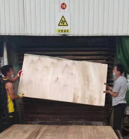 定型后的覆塑模板再經(jīng)過熱壓,需要達到一定的溫度和壓力,結(jié)合膠的作用,將其壓平固定成型。壓平后的模板,能夠增加模板的密實度,保證了每一張覆塑模板的膠合強度和硬度,提高了模板的使用質(zhì)量。